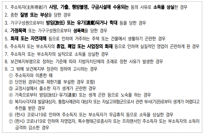본인 또는 본인과 생계와 주거를 같이하는 가구 구성원에게 위기상황이 발생하여 생계유지가 어렵되 된 경우 긴급지원대상자로 선정할 수 있습니다. 생계유지가 어렵게 된 경우는 아래의 어느 하나에 해당하는 경우입니다.